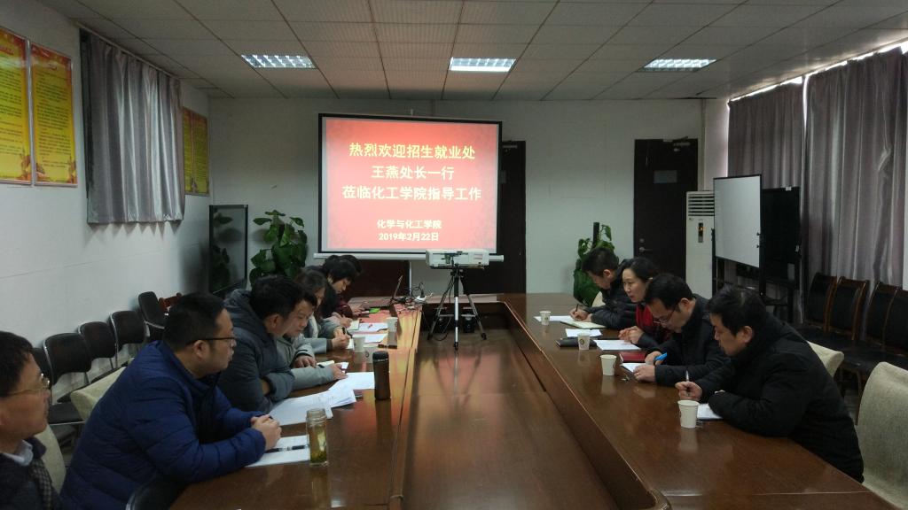 副书记凡蓉蓉代表学院汇报了招生就业工作开展情况。党委书记樊敏、院长李伟表示,非常感谢招生就业处一直以来对化工学院的指导和支持,并就2019年招生计划、招生宣传、就业市场、创新创业等各项工作与招生就业处进行了充分沟通和交流。