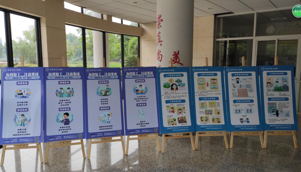 随着教职工进校办公逐渐增多,学院进一步普及疫情防控各项知识,结合湖北省卫生健康委员会发布的返岗复工海报,制作了“返校复学后工作场所如何防护”和“返岗复工礼仪”展板,图文并茂,使教职工更加直观、更加形象地了解各种防控注意事项,做好防护,更好地开展教学科研等各项工作。
