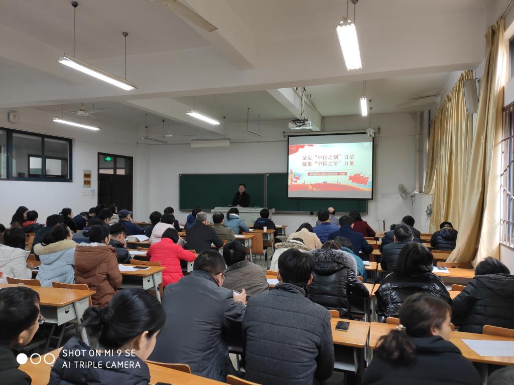 12月24日下午,化工学院在崇礼楼107举行党的十九届四中全会精神宣讲会,学校宣讲团成员、校党委委员、人事处处长高建勋以《坚定“中国之制”自信,凝聚“中国之治”力量》为题作宣讲报告。学院全体教职工、研究生、本科生代表参加了会议,学院党委书记樊敏主持宣讲会。