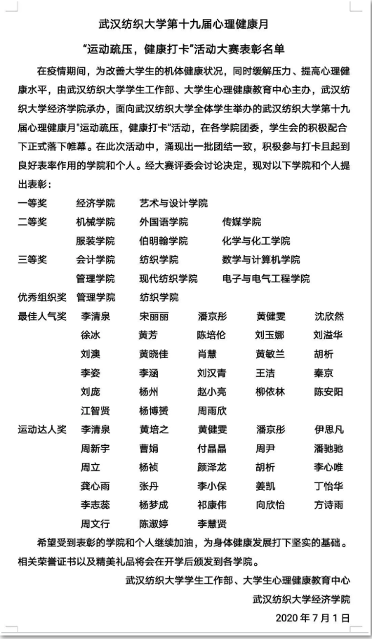 在疫情期间,为了改善大学生的机体健康状况,同时也能缓解压力,提高心理健康水平,由武汉纺织大学学生工作部,大学生心理健康教育中心主办,武汉纺织大学经济学院承办的面向武汉纺织大学全体学生举办的武汉纺织大学第十九届心理健康月"运动疏压,健康打卡"活动。化学与化工学院在此次活动中荣获二等奖。