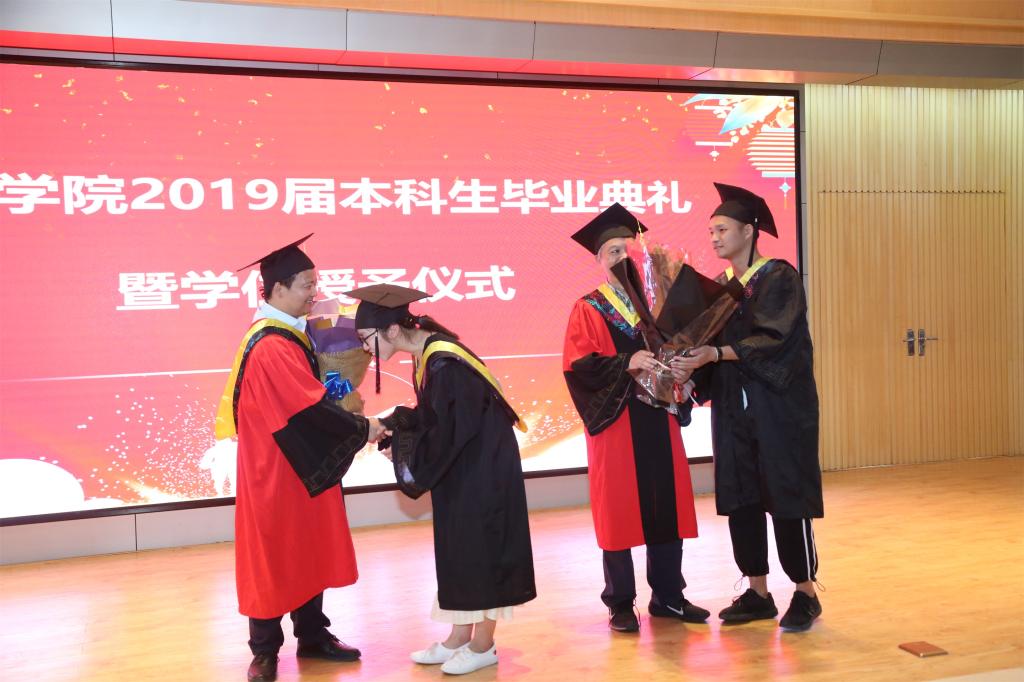 在优美的音乐中,李明副院长主持学位授予仪式,李伟教授上台为毕业生拨穗并合影留念,杨锋教授郑重地授予毕业生学位证书。2019届毕业生的大学旅途就此画上圆满句点。