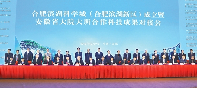 10月9日上午,合肥滨湖科学城(合肥滨湖新区)成立暨安徽省大院大所合作科技成果对接会在安徽合肥隆重举行,安徽省委书记李锦斌宣布开幕。省委副书记、省长李国英讲话,清华大学、复旦大学、中国科学院大学、北京航空航天大学等高校参加了会议,我校作为签约高校受邀与会,副校长姜明华带领科技处、化工学院、电子电气学院相关负责人出席了会议。学院夏明桂教授负责的武汉纺织大学与安庆安徽国孚润滑油工业有限公司共建循环经济研究院产学研合作项目现场签约,提升了学校知名度,为学校和学院的科研工作作出积极贡献。