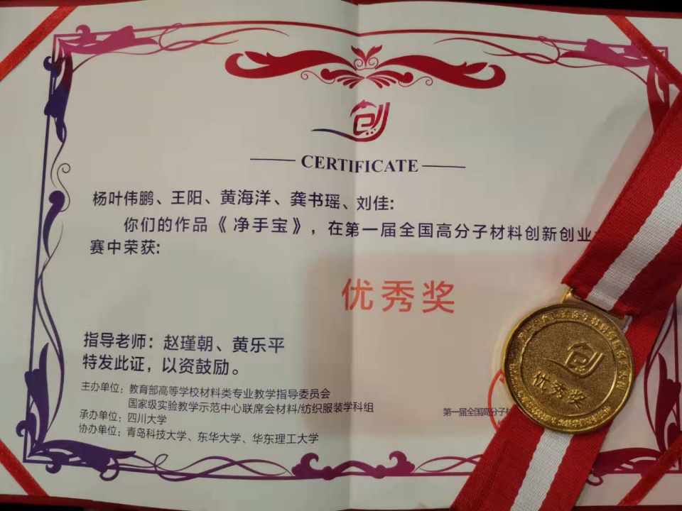 11月23-24日,第一届“全国高分子材料创新创业大赛”总决赛在四川大学举行。我校化学与化工学院杨叶伟鹏、王阳、黄海洋、龚书瑶、刘佳5名本科生组成的 “Protector”竞赛团队,在教师赵瑾朝、黄乐平指导下完成的“净手宝”项目,荣获第一届“全国高分子材料创新创业大赛”优胜奖。
