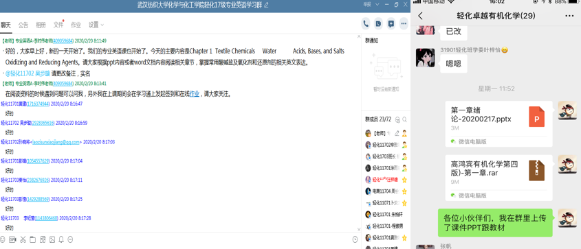 开课前,为了准确了解学生的实际情况,各年级辅导员及时通过QQ群和微信群与学生加强联系,掌握学生的联络方式、上网设备、网络状况等基本情况,及时了解学生上网课存在的实际困难和需求。为了帮助学生更好地适应线上学习模式,调整好学习状态,提高学习效率,化工学院老师们和学生通过多种形式进行沟通,为上好开学第一课,提前做好准备工作。