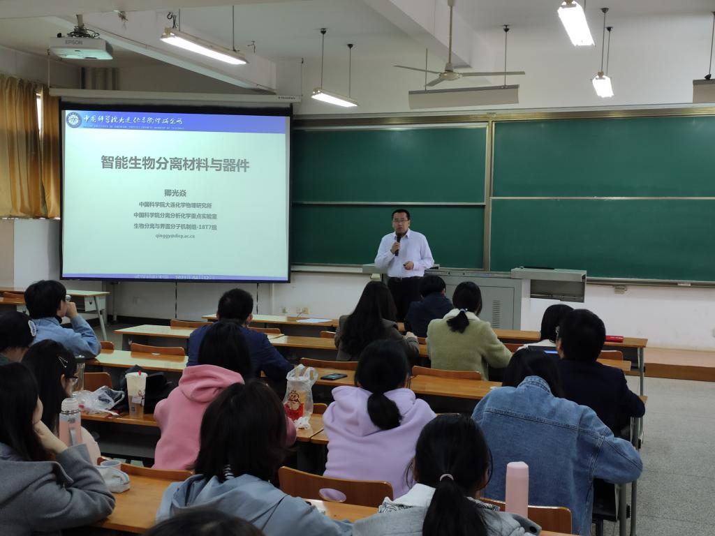 在学术报告中,他报告了团队近年来的研究进展,指出高纯度生物样品的获取是生物学功能研究的前提和基础,因而迫切需要开发新一代对目标生物分子具有高亲和力、特异性识别的富集和分离材料。然而由于生物样品种类繁多、结构各异、高度复杂,同时有价值的生物分子在血液或组织液中的含量极低,导致这类材料的开发非常具有挑战性。通过学习和模仿生物分子间特异性相互作用,结合智能聚合物构象转变,团队开发出生物分子响应性聚合物分离材料,很好地切合了这一需求,能够实现对目标生物分子的精准捕获,将在生物分离和分析领域获得广泛应用。这一方向融合了智能聚合物、主客体化学、微纳米器件构筑、精准测量和生物医学,是目前涌现的一个新兴学科方向,具有鲜明的开创性和广阔的应用前景。
