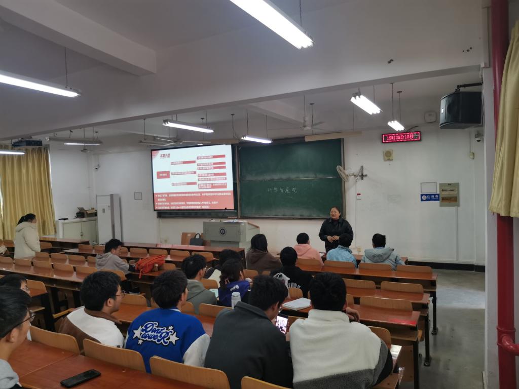 之后的班会中,樊敏就本学期的学习生活情况与同学们开展交流,她嘱咐同学们认真对待每一次课堂,细致完成每一天的学习任务,扎实学好专业知识,为自己在今后的激烈竞争中积蓄更多力量。同时,她建议同学们从现在开始,积极备战考研,努力实现自我提升。最后,樊敏提醒同学们有困难可以向学院反馈,也欢迎同学们常去她的办公室谈谈心聊聊天。