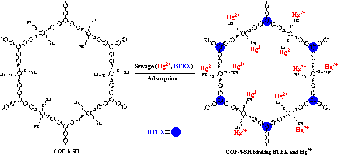 巯基共价有机框架(COF-S-SH)同时吸附废水中BTEX和Hg(II)示意图