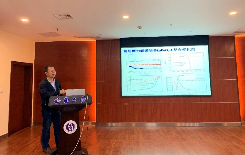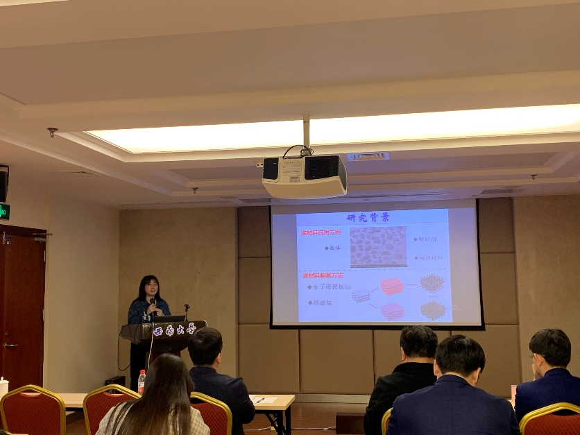 肖萍博士作题为“原位模板法合成多级空碳材料用于电催化4-硝基苯酚还原”口头报告,重庆大学魏子栋教授在提问环节,指出了电催化传质问题是文章的创新点,仍需进一步开展深入研究,为青年教师指点了研究方向。