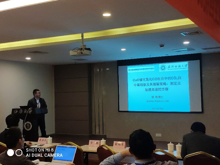 程锴博士作题为“CuO催化氧化CO反应中的CO2自中毒现象及其缓解策略:测定及加速其速控步骤”口头报告,并与会场专家学者交流。