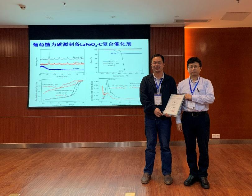 朱君江教授作题为“高性能钙钛矿催化剂的制备及其催化应用”邀请报告,并与南昌大学王翔教授等专家交流、讨论,获颁“环境催化与绿色化学Ⅰ”分会Keynote报告人。