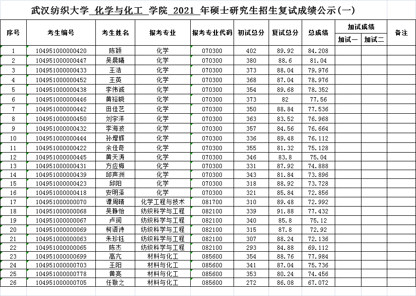 化学与化工学院2021年硕士研究生招生复试成绩公示(一)