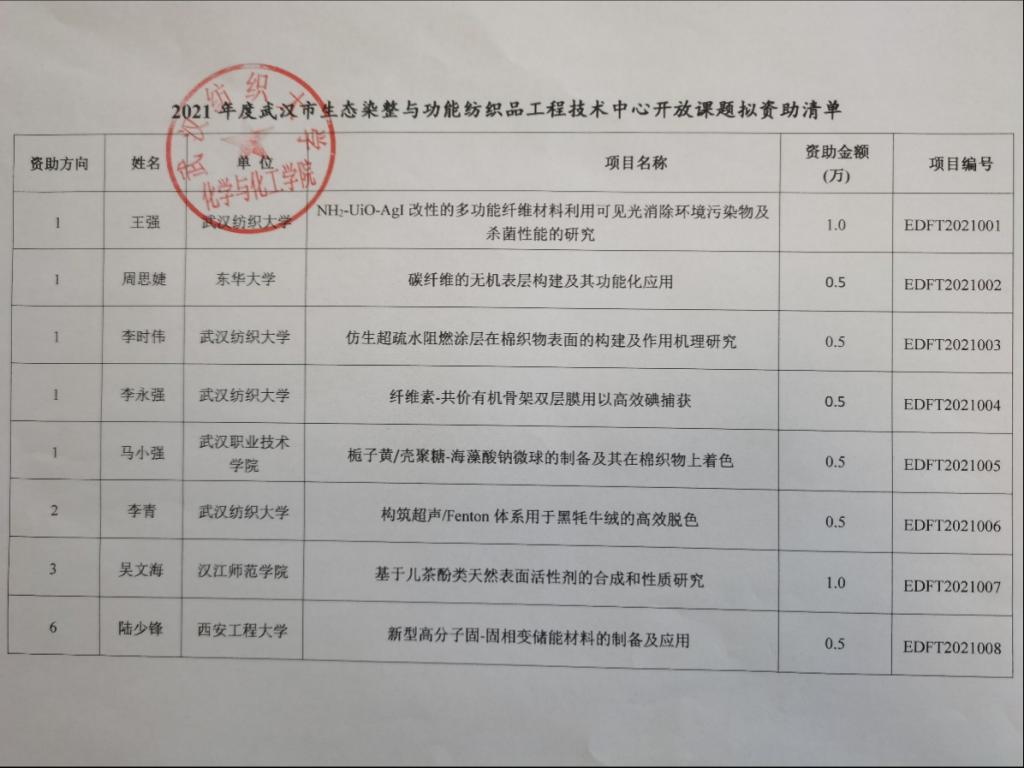 2021年度武汉市生态染整与功能纺织品工程技术中心开放课题已完成征集和评审工作,经学术委员会专家评审,按照通知中重点、优先资助方向,工程技术中心拟资助重点项目2项、一般项目6项,具体见下表。一般项目与重点项目项目的课题经费均当年一次性拨付。