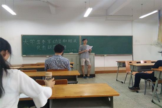 化工学院响应号召于2017年5月21日在6栋教学楼405教室召开了大学生参军动员和相关优惠措施宣讲。