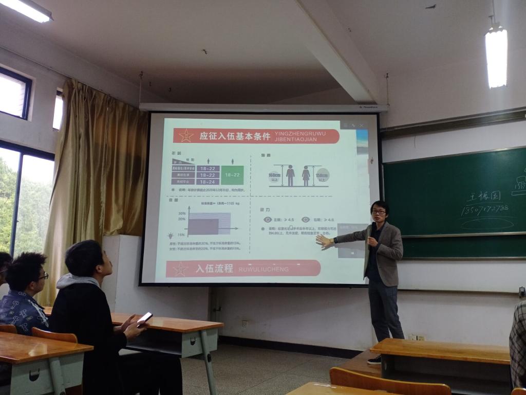 谈鹏老师针对应征入伍基本条件、应征入伍流程进行逐条讲解,结合往届入伍学生发展现状,着重解读了大学生参军优惠政策,并现场回答了同学们的相关问题。此次动员活动效果良好,目前已有学生响应号召,报名应征。