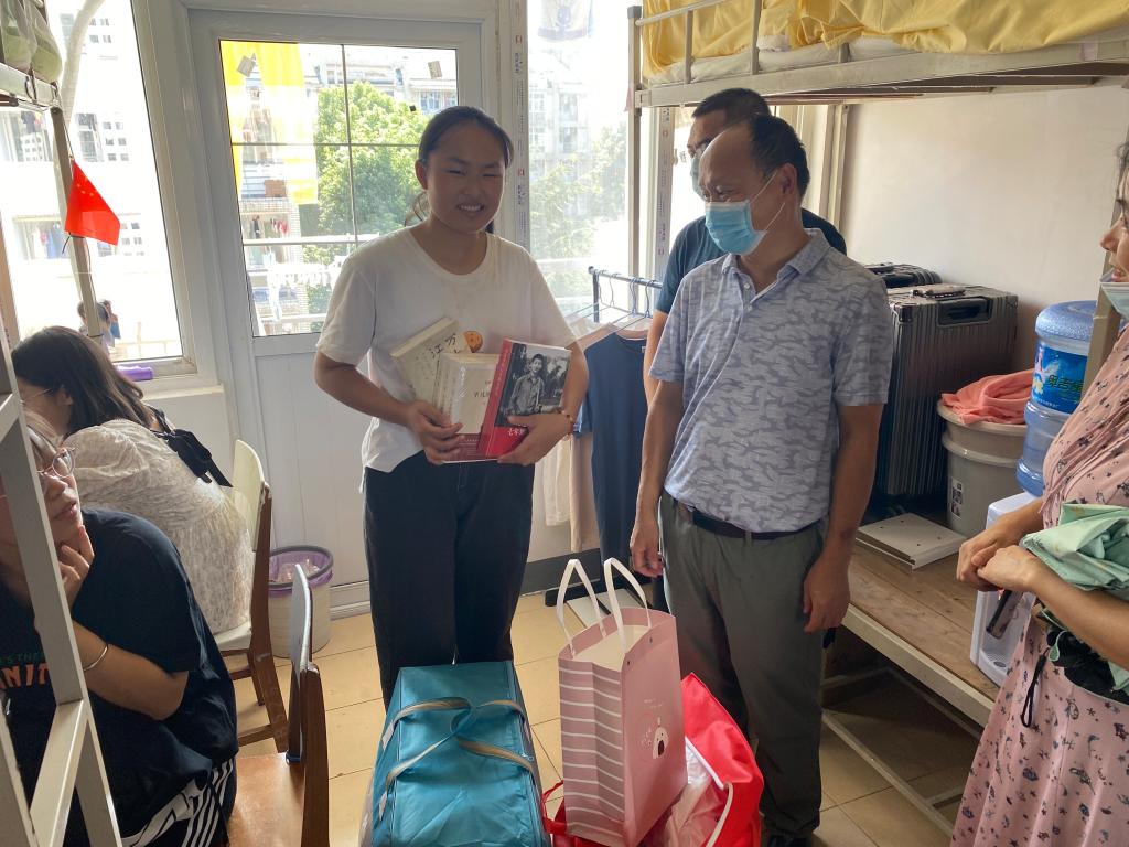 作为年仅14岁、全校入学年龄最小的新生,杨青荷从还未报道就受到了学校和学院的高度关注和关心。杜勇和杨青荷亲切交谈,仔细询问她入学报道后各方面的适应情况,详细了解她在生活、学习情况以及目前存在的困难。当看到桌面上摆放着正在做的工图作业,他勉励杨青荷和同寝室的同学们们要保持这种学习态度和劲头,发扬“学在化工”的优良传统,他把《习近平的七年知青岁月》《平凡的世界》等书送给杨青荷,嘱咐她在课余之际,多读书。他表示,习近平总书记在梁家河村插队时,是几个北京知青当中年纪最小的,但他在艰苦磨炼的同时从来没有放弃读书和思考。同学们要认真地读《习近平的七年知青岁月》,向总书记学习,做有时代担当的新青年。杜勇还嘱咐同学们要保持寝室卫生,平日做好防护,强化安全意识,遇到困难及时与辅导员、班主任老师沟通交流。他还希望大家尽快适应环境,转变角色,建立和谐友好的人际关系,以积极的心态和良好的面貌坚实迈出大学生活的第一步。