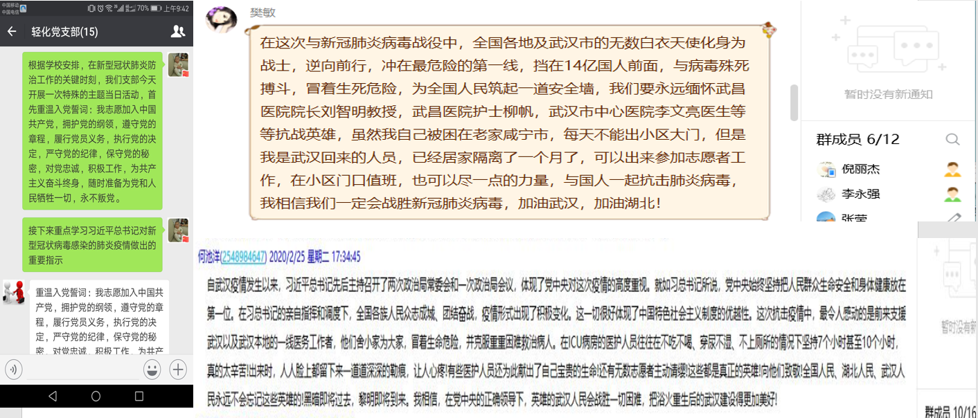接着,在各党支部书记的带领下,全体党员认真学习习近平总书记关于疫情防控的重要讲话精神和党中央、国务院有关决策部署,宣传省、市防控要求。要求全体党员每天要及时准确上报个人健康状态,落实好“日报平安”工作;主动向所在社区(村组)报到,积极参加所在社区(村组)的疫情防控工作,积极参加学校隔离点房间清理工作,为疫情防控贡献自己的一份微薄力量。