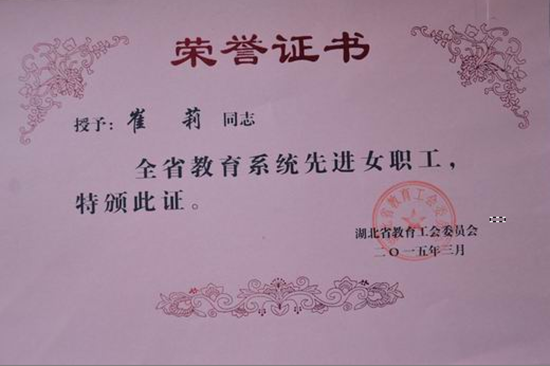 湖北省教育工会八届二次全委(扩大)会暨女职工三届一次委员会会议获悉,我院崔莉老师喜获“先进女职工”称号。