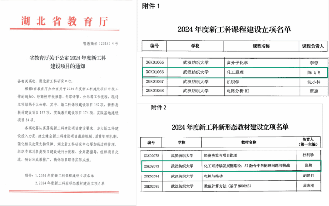 近日,湖北省教育厅正式发布《2024年度新工科建设项目立项名单》,我院化工系教师团队申报的两项项目成功获批。其中,陈飞飞主持的《化工原理》课程获批新工科课程建设立项,张然主编的教材《化工可持续发展新路径:AI融合中的伦理问题与挑战》获批新工科新形态教材建设立项。此次立项是我院深化新工科改革、推进教学创新的又一重要成果,彰显了学科建设的前瞻性与实践价值。