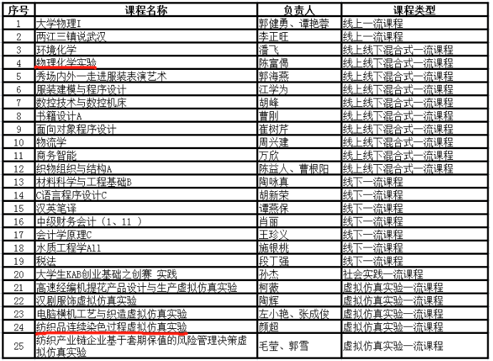 12月6日湖北省教育厅发布了《省教育厅关于公布2022年度省级一流本科课程认定结果的通知》(鄂教高函〔2022〕16号)。学校共有25门课程被认定,我院两门课程位列其中:陈富偈老师负责的《物理化学实验》认定为线上线下混合式一流课程、颜超老师负责的《纺织品连续染色过程虚拟仿真实验》认定为虚拟仿真实验一流课程。