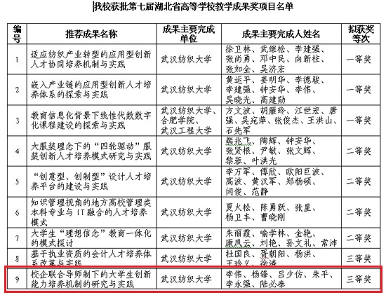 根据《湖北省教学成果奖励办法》(湖北省人民政府令第292号)和《省教育厅关于认真做好第七届湖北省高等学校教学成果评审奖励工作的通知》(鄂教高〔2012〕8号)精神,经省政府同意,近日,第七届湖北省高等学校教学成果评审委员会对各校推荐申报的教学成果进行了评审,我校有9项教学成果获奖,其中我院李伟、杨锋、吕少仿、朱平、李永强、陆必泰等老师完成的《校企联合导师制下的大学生创新能力培养机制的研究与实践》获得三等奖。