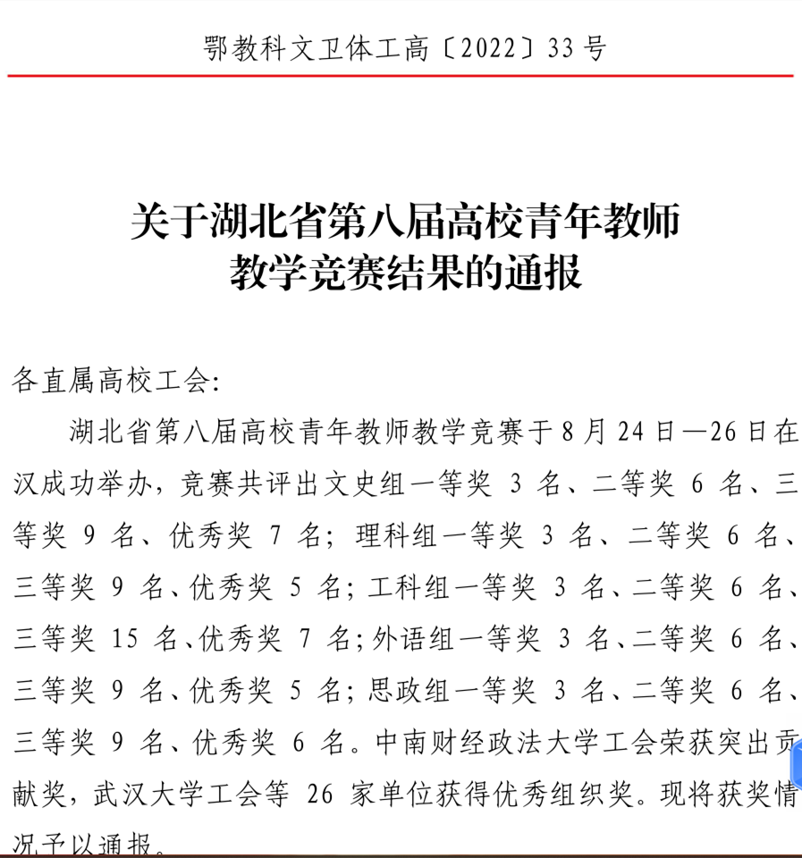 湖北省高校青教赛每两年举办一届,是湖北省教育系统工会组织举办的规模最大、规格最高的教师教学技能竞赛。化工学院教师在本次竞赛中荣获三等奖,这也是继崔莉、刘丽君两位老师获得湖北省高校青教赛三等奖之后,学院再次获得三等奖,不仅展现了学院青年教师优秀综合素质、专业水平和教学技能,更体现了学院对青年教师培养的高度重视,坚持把组织参与青年教师教学竞赛作为促进高素质专业化教师队伍建设的有效途径,为进一步激发教师热爱教学、钻研教学的热情,为弘扬劳模精神、劳动精神和工匠精神发挥了积极作用。