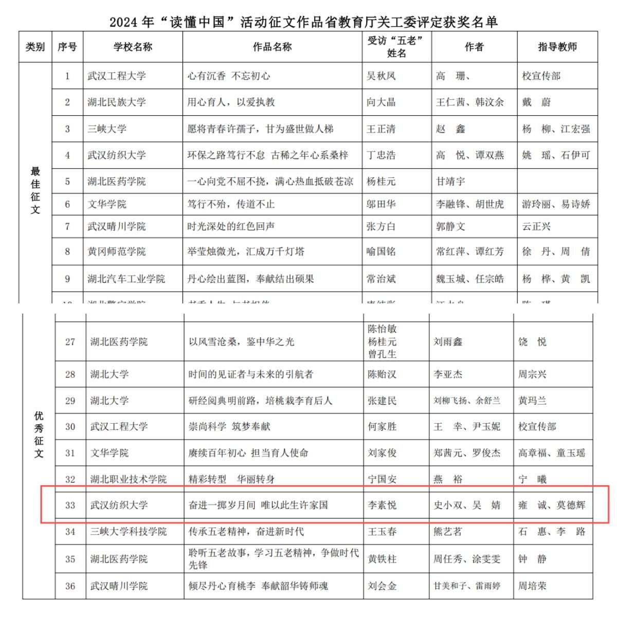 近日,湖北省教育厅关工委公布了2024年“读懂中国”活动入选作品名单,化工学院选送的由莫德辉、雍诚老师指导,史小双、吴婧等学生撰写的《奋进一掷岁月间 唯以此生许家国》文章获评“湖北省优秀征文”。