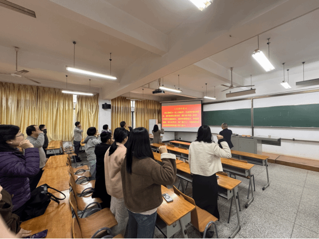 领学结束后,全体教职工进行了“温誓词、立承诺”教师宣誓活动,在优秀教师代表李晓霞教授的带领下,全体教职工高举右拳,庄严肃穆,誓言字字千钧,表达了教师们坚守教育初心、牢记育人使命、恪守师德规范的坚定决心。他们承诺,将以高尚的师德、扎实的学识,为学生的成长成才保驾护航,为教育事业的发展贡献自己的力量。