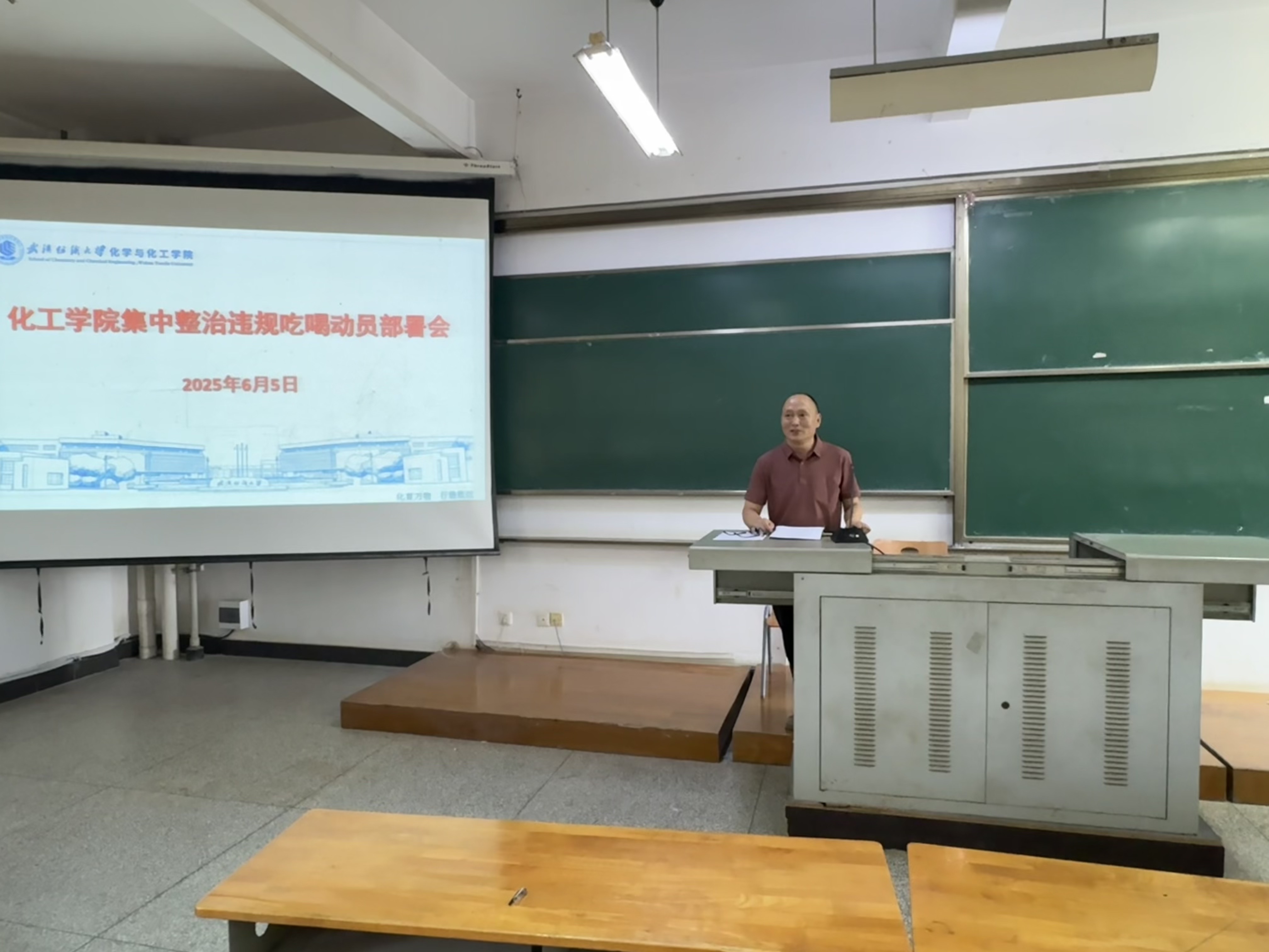 为深入贯彻落实全面从严治党要求,持续推动深入贯彻中央八项规定精神学习教育走深走实,进一步加强作风建设,2025年6月5日,在崇礼楼220教室,化工学院召开集中整治违规吃喝问题专项动员部署会。学院党委书记杜勇主持会议并作动员讲话,学院领导班子成员、全体教职工参会。