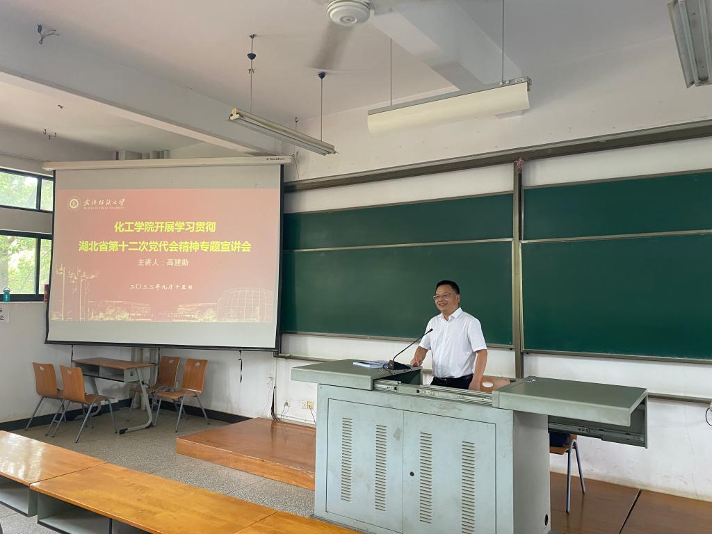 为深入学习贯彻习近平总书记考察湖北重要讲话精神,推进落实湖北省第十二次党代会决策部署,9月15日下午,化工学院举办湖北省第十二次党代会精神宣讲会。学校宣讲团成员、学校办公室主任高建勋教授应邀作宣讲,学院全体教职员工参加,宣讲会由学院党委书记杜勇主持。