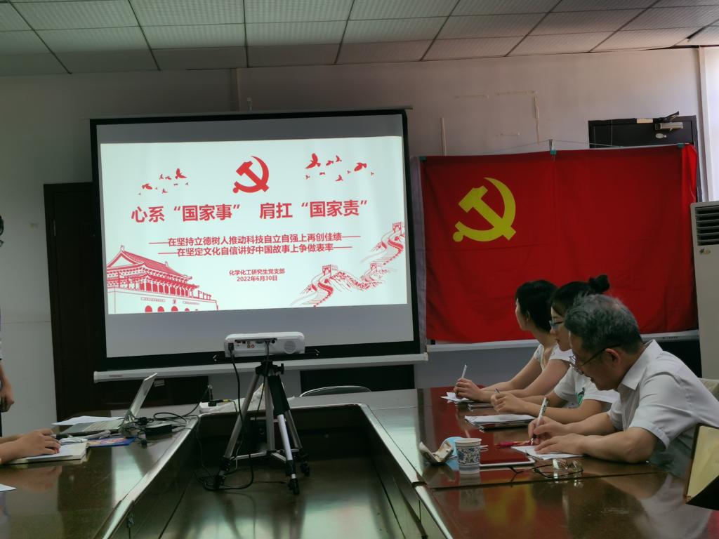化工学院化学化工研究生党支部于2022年6月30日下午在崇礼楼204C会议室召开“心系‘国家事’,肩抗‘国家责’”主题党日活动。校党委常委、副校长唐敏教授和化工学院党委书记杜勇全程参加了此次主题党日活动。