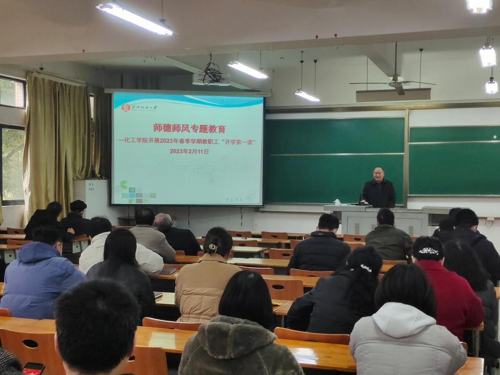 为进一步学习贯彻习近平新时代中国特色社会主义思想,深入落实立德树人根本任务,规范新时代高校教师履职履责行为,稳步推进师德师风建设,2023年2月11日上午,化工学院组织全体教职工在崇礼楼210教室开展新学期师德师风专题教育活动,党委书记杜勇为教职工讲授了“开学第一课”。学院班子成员、全体教职工参加。