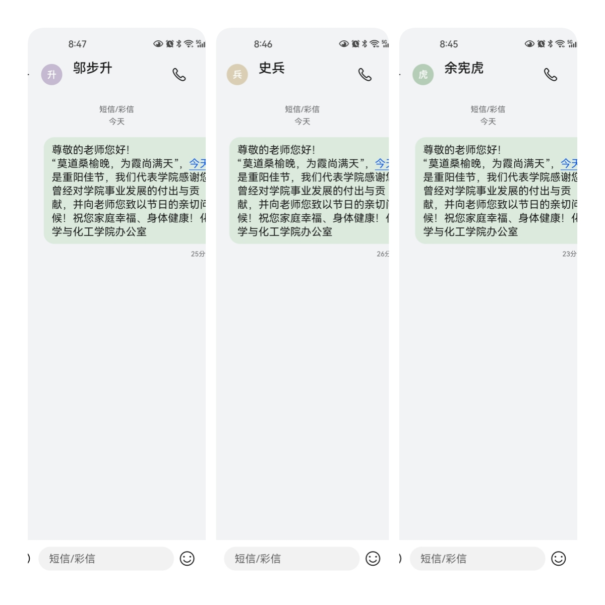 今年除登门看望老同志以外,学院还逐一发短信给退休教师,给他们送去节日的祝福和诚挚的问候。