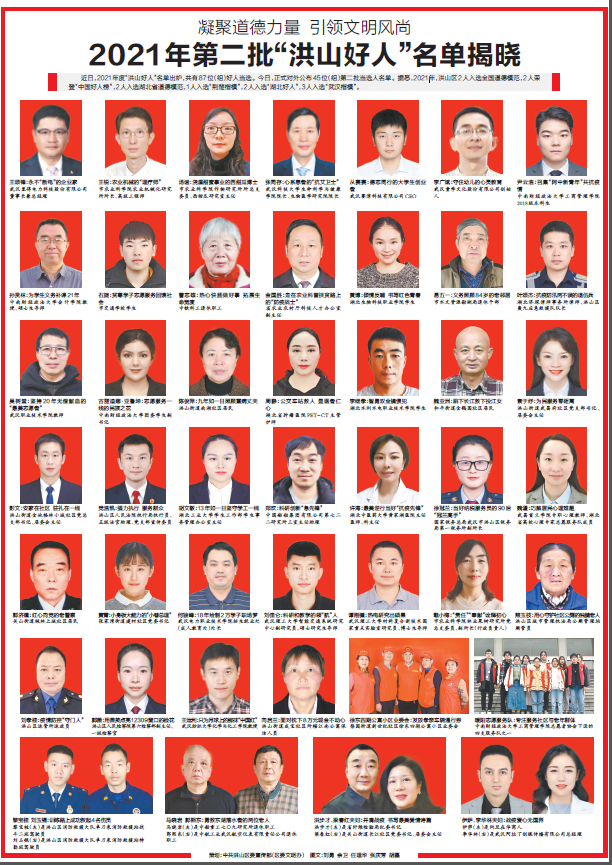 近日,2021 年度“洪山好人”名单出炉,共有87 位(组)好人当选,武汉纺织大学化学与化工学院王运利教授成功入选。