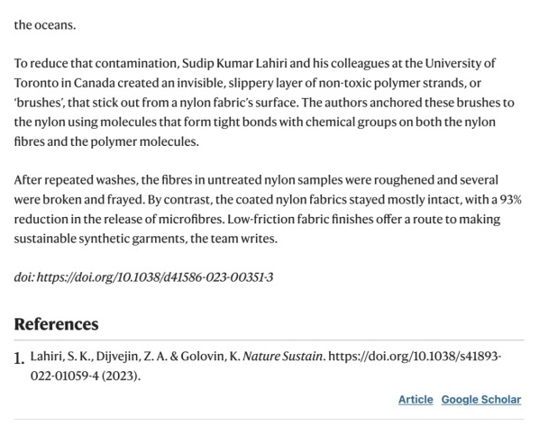 近日,世界顶级期刊Nature(自然)杂志以How to stop fleece clothes from fouling the sea: bring in the tiny brushes(如何防止羊毛织物污染海洋:神奇的小刷子)为题刊登了化学与化工学院2015届纺织化工专业孟加拉籍校友苏迪普(Sudip Kumar Lahiri)科研成果。该期刊为现今科学界普遍关注的国际性、跨学科的周刊类科学杂志。