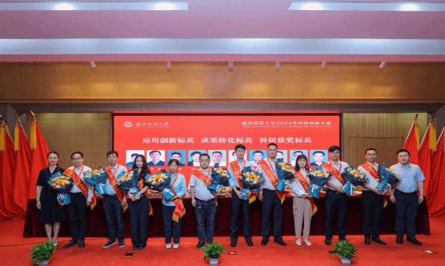 (校领导程碧海、姜明华、金艳、王栋、李华君为科研标兵颁奖)