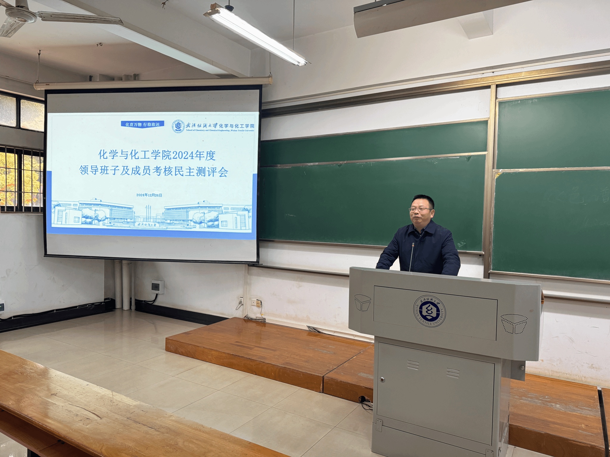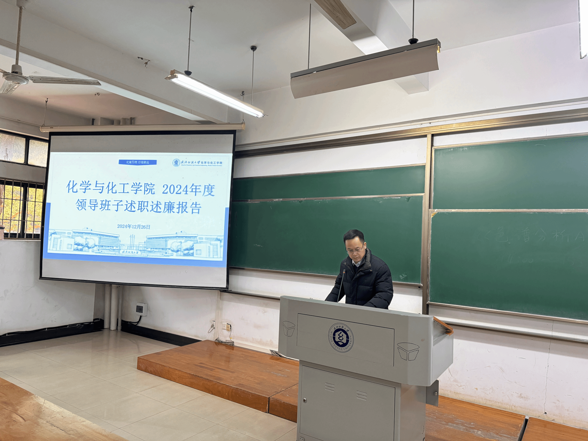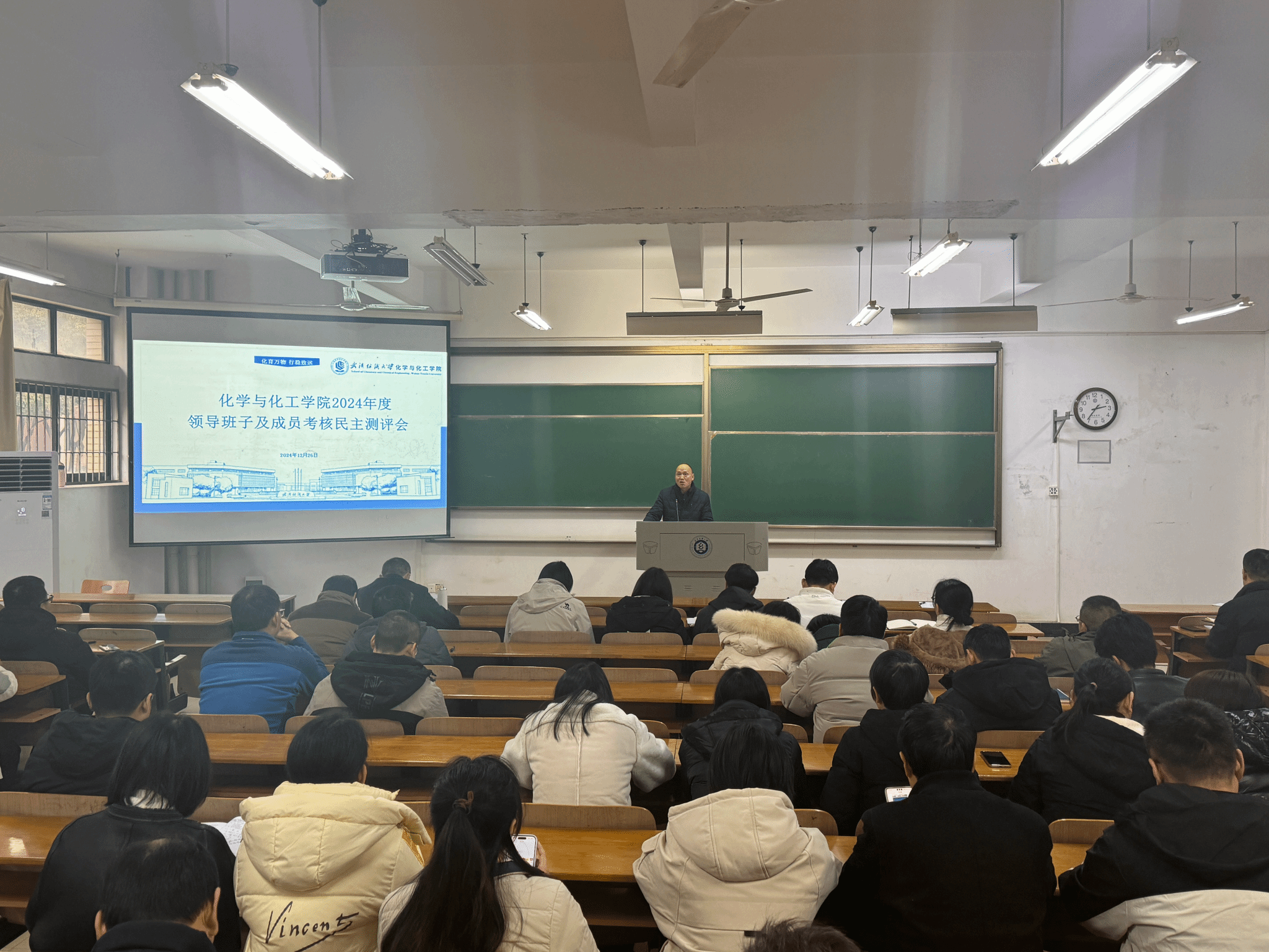 12月26日下午,根据学校部署,化工学院在崇礼楼110召开全体教职工大会,开展2024年领导班子述职述廉和民主测评工作。院长朱君江代表学院领导班子进行了述职述廉,受学校党委委派,学校办公室主任高建勋组织全体教职工对领导班子和个人进行了民主测评工作。会议由学院党委书记杜勇主持。