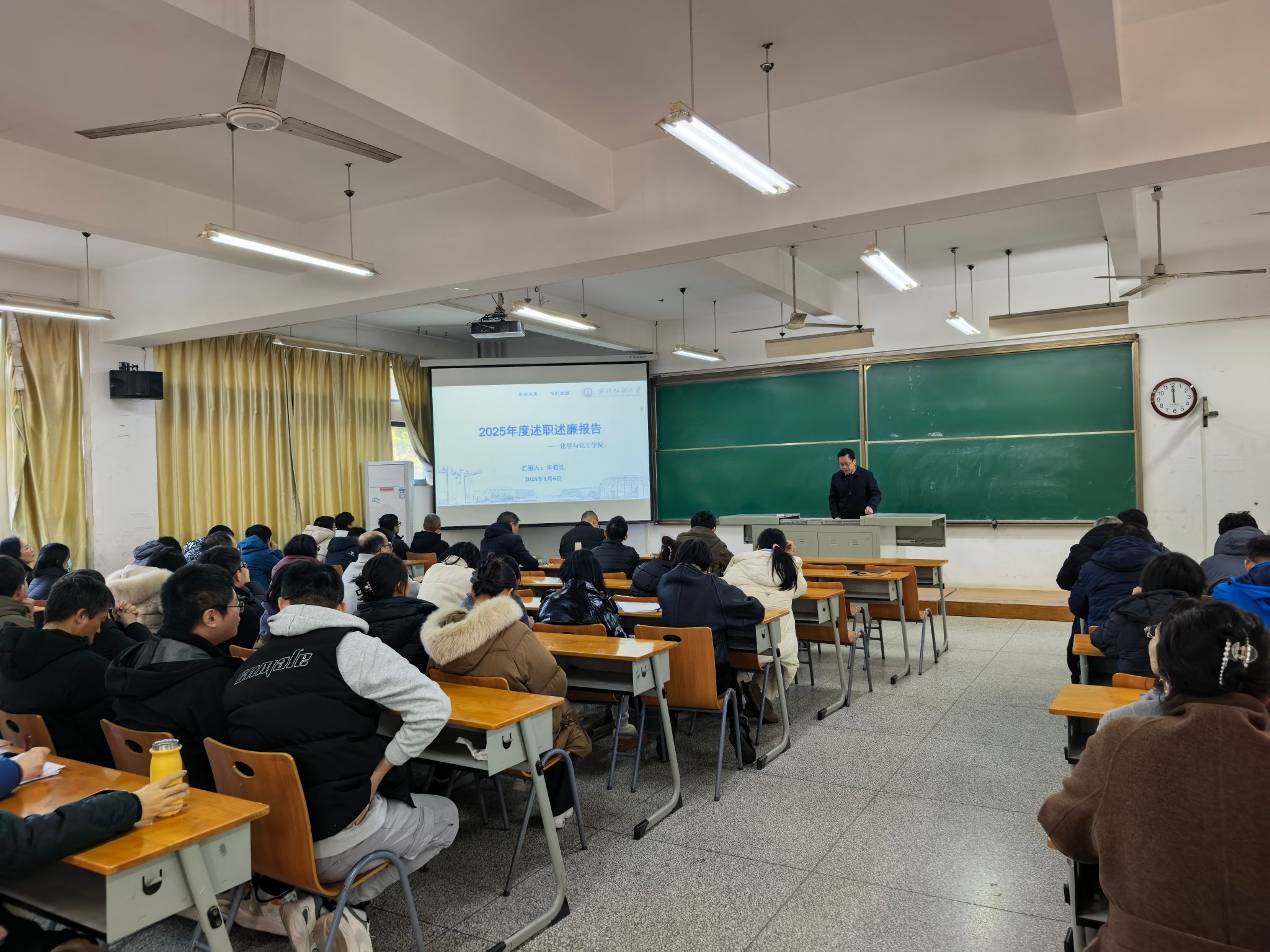 2026年1月6日下午,化工学院2025年领导班子和干部述职考核测评会在崇礼楼221教室顺利召开。学院全体领导班子成员、教职工参会,学校考核组由图书馆党总支书记曾荣带队,何志俊、毕慧婷两位老师一同出席测评会。会议由曾荣主持,核心目的在于全面、客观、精准评价领导班子及干部年度履职成效,进一步强化干部责任担当意识,为推动学院各项事业高质量发展凝聚奋进力量。