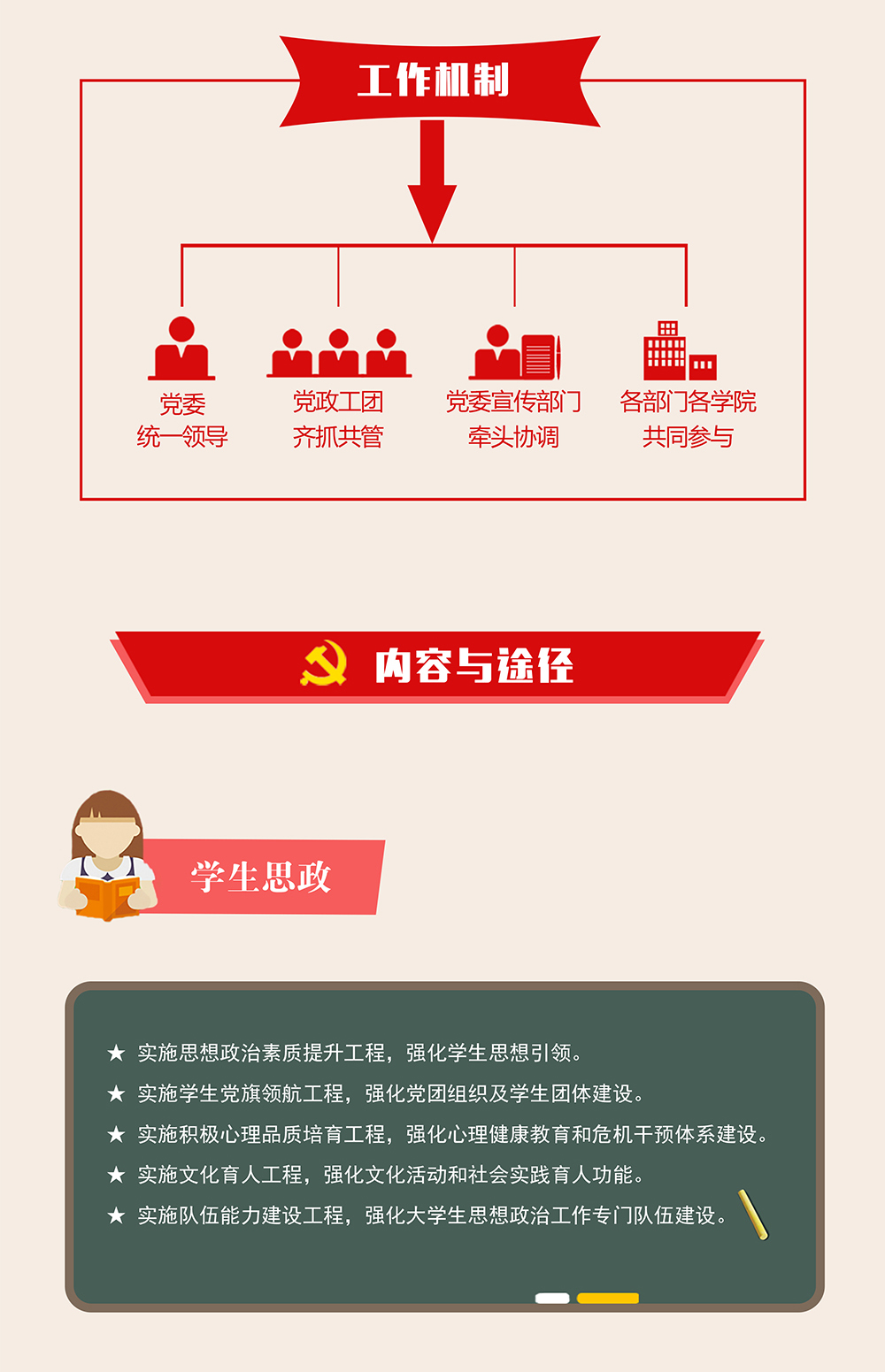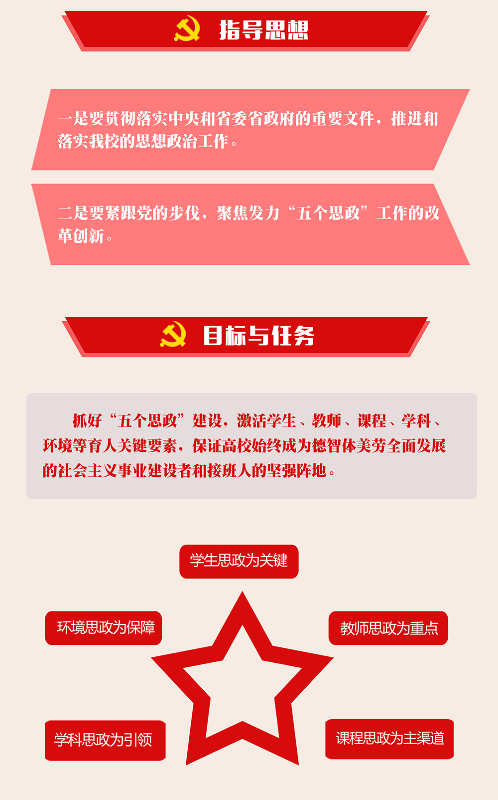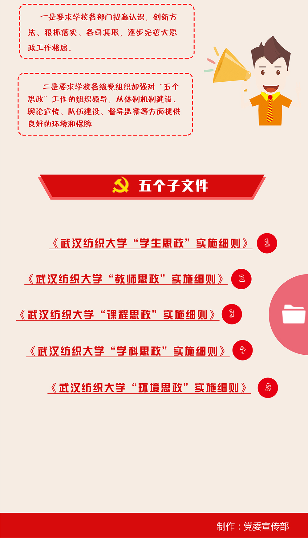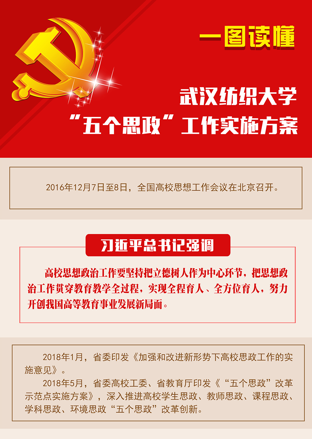 党委书记樊敏带领大家共同学习《武汉纺织大学“五个思政”工作实施方案》。她表示,湖北省委高校工委、省教育厅印发《“五个思政”改革示范点实施方案》,深入推进高校学生思政、教师思政、课程思政、学科思政、环境思政“五个思政”改革创新,是新时代湖北高校思政工作的创新抓手,是落实全员全过程全方位“三全育人”理念的湖北品牌。她强调,培养社会主义建设者和接班人,是我们党的教育方针,是我国各级各类学校的共同使命。
