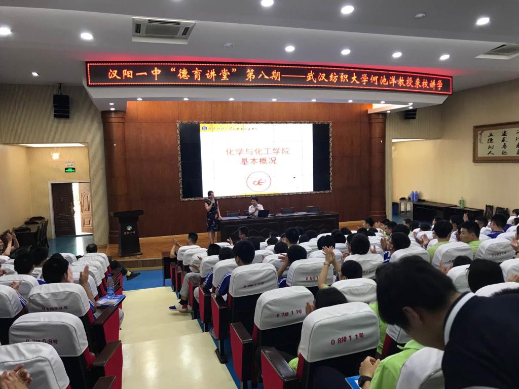 5月16日,化工学院李伟院长、何池洋教授、副书记凡蓉蓉、工会主席李卫东一行四人到我校优质生源基地汉阳一中开展招生宣传讲座。何池洋教授开展了一场《魅力化学》的精彩学术讲座,讲座由汉阳一中副校长郑永艳主持,汉阳一中高一、高二的三百多名学生代表和部分教师聆听了此次讲座。