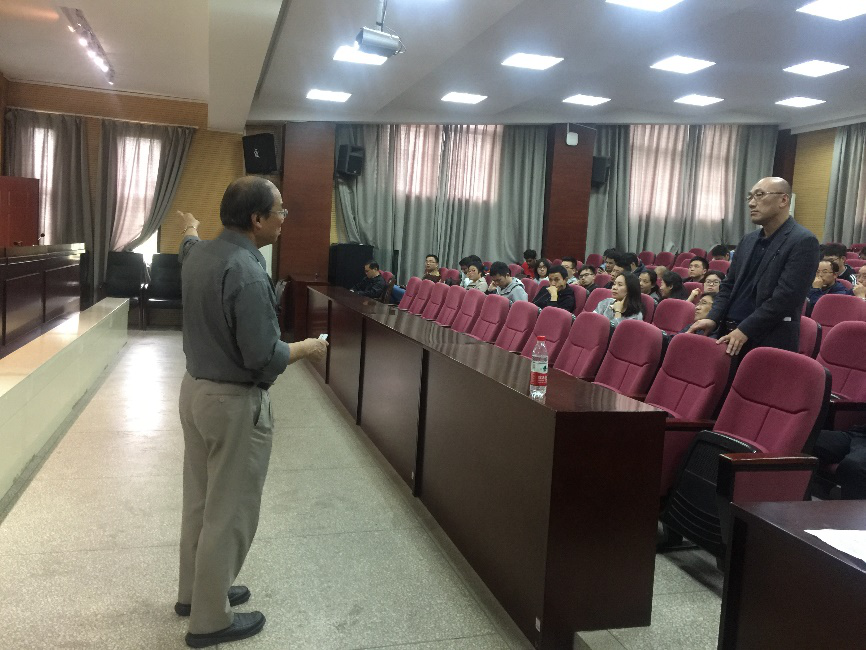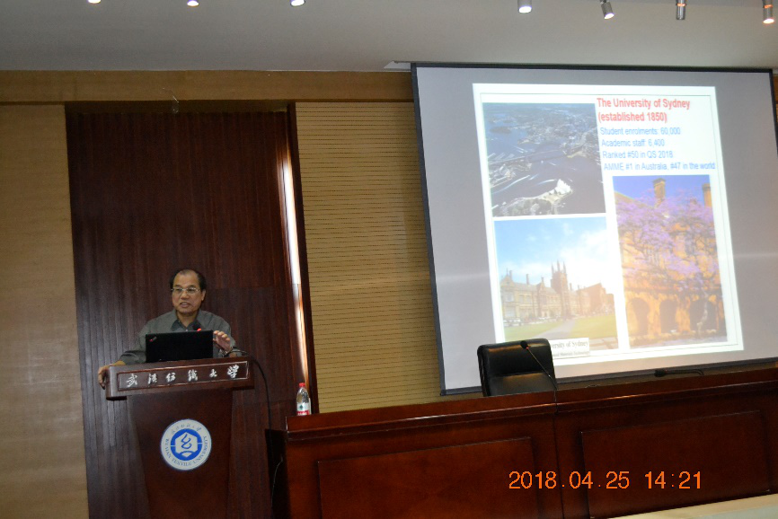 2018年4月25日,应武汉纺织大学化学与化工学院邀请,国际著名材料学家和力学家米耀荣(Yiu-Wing Mai)院士来我校进行学术交流。在行政楼二楼学术报告厅做了题为“Fabrication and Mechanical Properties of Composite Laminates Based on 3D Graphene Foams and 2D Graphene Nanosheets”的学术报告。