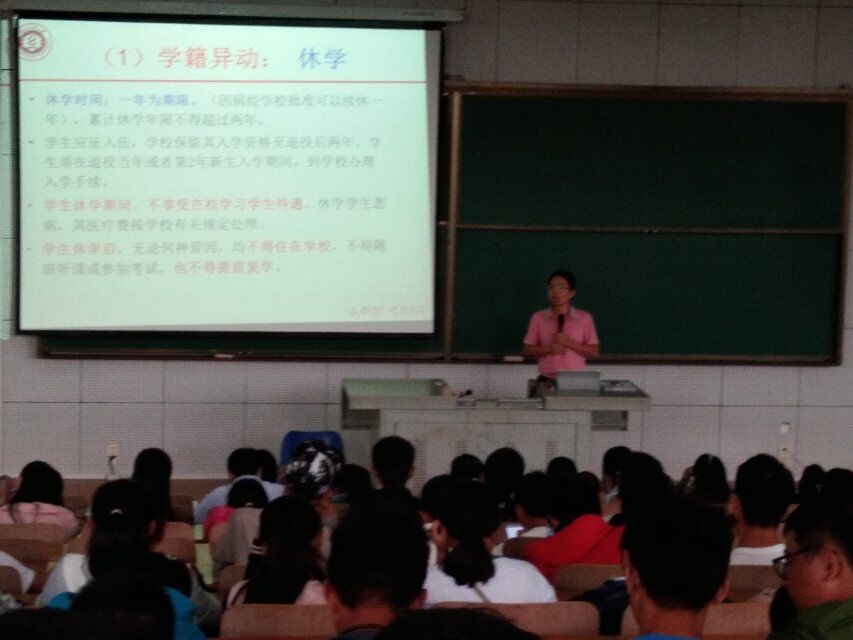 为使新生更加了解学校学籍相关管理规定,教学副院长李明为新生开展了学籍管理讲座。其幽默的话语、多彩的课件,深入浅出地向17级新生介绍了“学籍管理”,“教学安排”,“学分获取”,“学位授予”,“毕业方向”等五个方面的内容。帮助大家学习如何处理将来学习中遇到的学籍问题,并对学籍异动进行了详细介绍,也用历届考研数据激励新生们学习积极性。同时引导同学们以乐观进取的心态对待即将开始的大学生活,强调了新生应该给自己的大学做个合理的规划,并确立正确的目标、保持积极的心态,让自己做一个德、智、体、美、劳全面发展的新时代大学生。