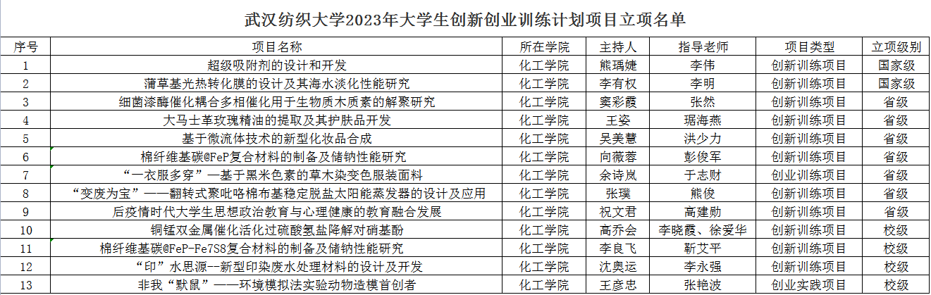 根据《教育部高等教育司关于开展2023年国家级大学生创新创业训练计划立项和结题验收工作的通知》以及《湖北省教育厅关于做好2023年大学生创新创业训练计划立项和结题验收工作的通知》要求,经师生申报、学院评审、专家复审,我院2023年大学生创新创业训练项目共立项13项,其中国家级2项、省级7项、校级4项,立项数量位居全校第二位。