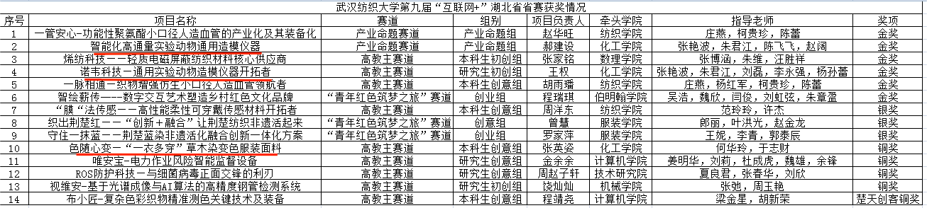近日,第九届中国国际“互联网+”大学生创新创业大赛湖北省省赛获奖项目评审结果公示。经网络评审和现场路演答辩,武汉纺织大学参赛团队共获得金奖6项、银奖3项、铜奖5项,其中化工学院指导团队获2金1铜,获奖级别和数量均取得新突破。