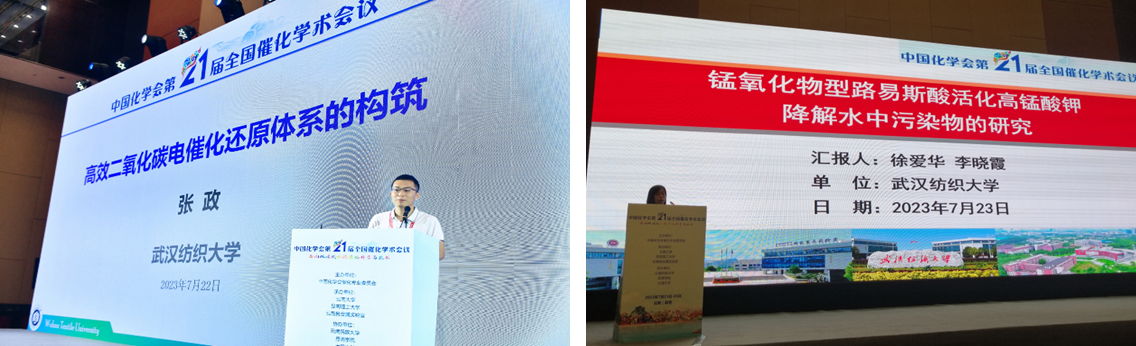 武汉纺织大学化工学院院长朱君江、李晓霞、张政、毕慧婷、肖萍、徐骁和赵帅奇等老师参加此次会议,与来自全国各地的催化工作者进行了深入交流和探讨。我院青年教师张政博士在“二氧化碳资源化转化利用”分会场做了“高效二氧化碳电催化还原体系的构筑”为题的邀请报告,李晓霞教授在“环境催化”分会场做了“锰氧化物型路易斯酸活化高锰酸钾降解水中污染物的研究”的报告。