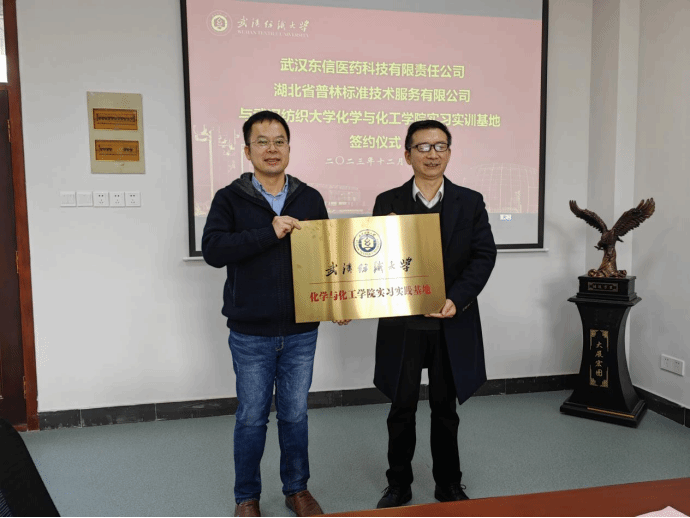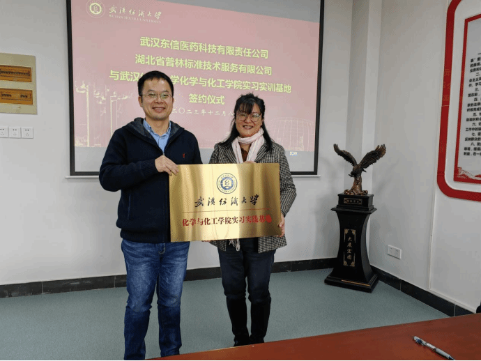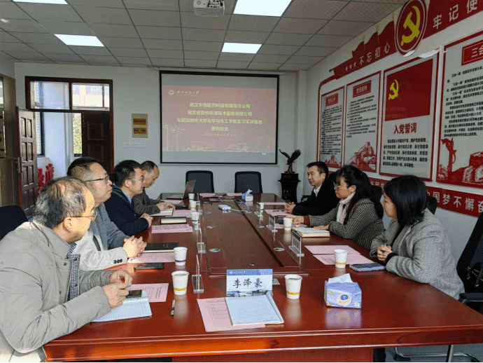12月8日,我院与武汉东信医药科技有限责任公司、湖北省普林标准技术服务有限公司实习实训基地签约仪式在崇礼楼201会议室举行。这次签约仪式,是院党委书记杜勇和院长朱君江暑期分别带队到两家公司交流后,双方合作取得实质进展的重要体现,标志着校企合作进入了新的阶段。化工学院党委书记杜勇、院长朱君江、副院长陈飞飞及化妆品系教师代表、武汉东信医药科技有限责任公司党支部书记刘文富、湖北省普林标准技术服务有限公司总经理程立红等人出席了活动。仪式由杜勇主持。