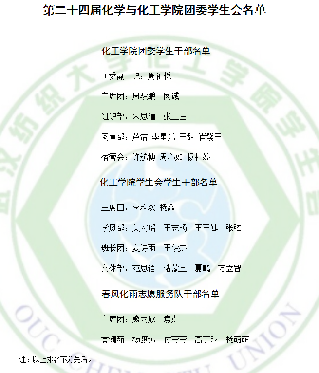 我院于5月20日召开了团委学生会换届大会,进行了团委学生会主席团、主要学生干部选举。现将化学与化工学院第二十四届团委学生会主席团、主要学生干部选任结果公示。公示期为年5月25日至30日,如有异议,请到“春风化雨”学生成长驿站当面反馈或实名来电:027-59367246(雍老师)。
