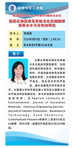 9月19日上午,化学与化工学院在阳光校区6号楼205会议室举办了学校第659期阳光论坛,李晓霞教授做了题为《锰氧化物型路易斯酸活化高锰酸钾降解水中污染物的研究》的学术报告,学院教师及研究生代表参加了本次学术论坛。