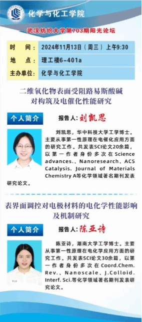 2024年11月13日上午,化学与化工学院在阳光校区6号教学楼401举办学校第703期阳光论坛。本次论坛上,刘凯思博士做了题为“二维氧化物表面受阻路易斯酸碱对构筑及电催化性能研究”的报告,陈亚诗博士做了题为“表界面调控对电极材料的电化学性能影响及机制研究”的报告,学院教师、研究生及本科生代表20余人参加论坛。