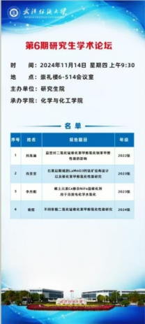 2024年11月14日上午9点30,化学与化工学院在崇礼楼514会议室举办了第6期研究生学术论坛。2022级硕士生刘禹涵、2023级硕士生肖雯雯、李丹阳和2024级硕士生骆煜分别介绍了自己的科研工作。技术研究院教师、化工学院教师、化工学院研究生共20余人参与本次研究生论坛。
