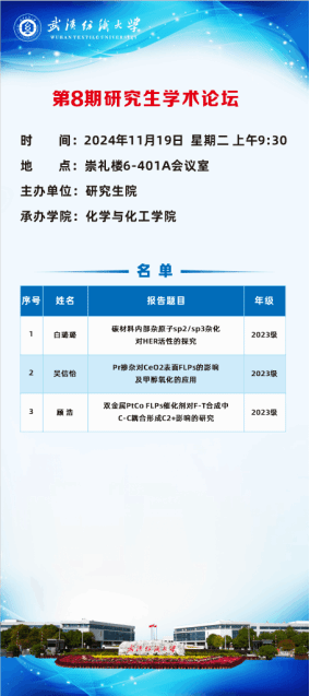 2024年11月19日上午9点30分,化学与化工学院在6号教学楼401会议室举行了2024年度第8期研究生学术论坛。刘凯思博士、陈亚诗博士、研究生及本科生代表二十余人参会。2023级研究生吴信怡、白璐璐和顾浩分别进行了报告,介绍了当前课题研究现状并分析了课题推进过程中所遇到的挑战与难题。随后研究生师兄师姐周梦婷、刘彤彤、何亚南、王子卿等分享了自身经验,具体包括如何应对理论计算瓶颈、如何提高理论计算效率和实验难题、如何在理论与实践之间寻找平衡等。